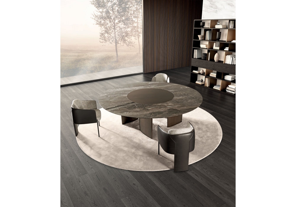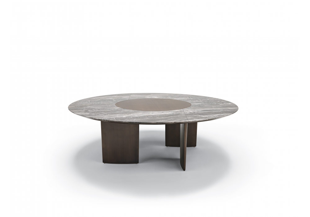 Ala Round firmata da Ferruccio Laviani per MisuraEmme è una serie di tavoli con base legno in essenza, laccato opaco o laccato opaco anticato. Piano sagomato rotondo in marmo con sottopiano laccato. Per il piano rotondo diametro 155 cm e 165 cm è prevista l’opzione di un piano sagomato girevole in marmo (Lazy Susan) in appoggio su piano centrale; per le altre dimensioni il piano girevole incassato, sempre obbligatorio, è in marmo, laccato opaco oppure laccato opaco anticato.