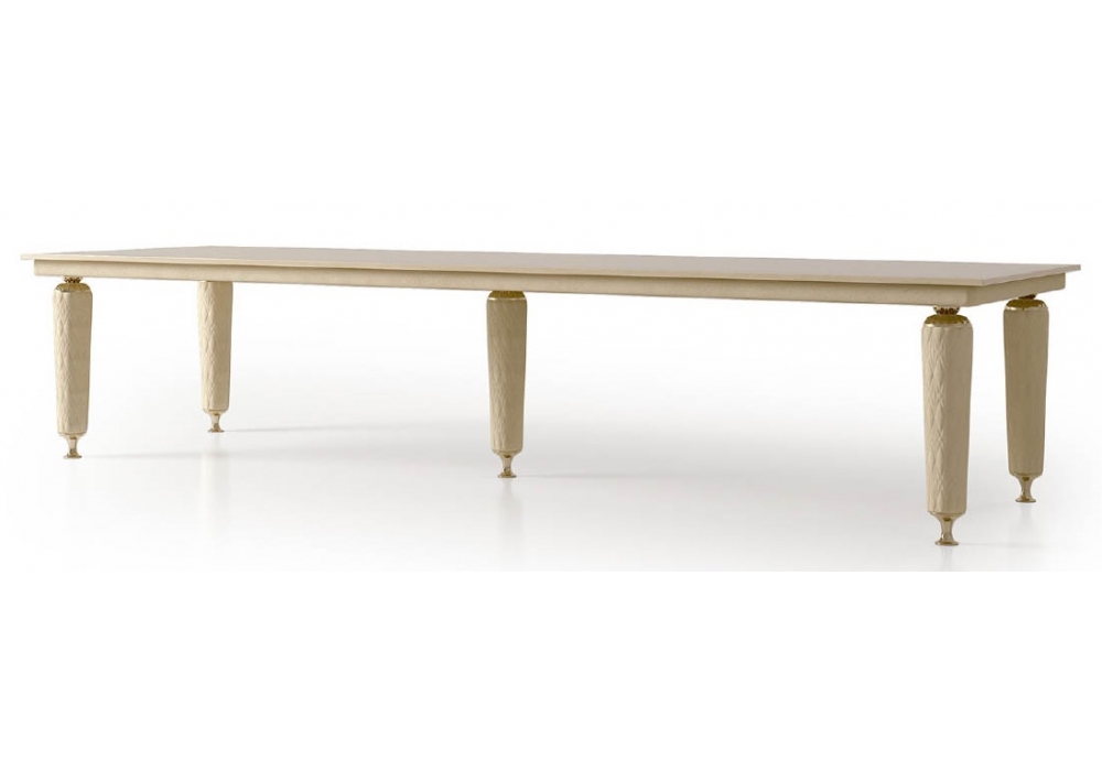 Numero Tre firmato da Roberto Serio per Turri è un tavolo con struttura e piano in MDF e pannelli di particelle di legno in finitura lucida. Gambe in pelle ricamata e dettagli in metallo dorato. Disponibile in diverse dimensioni.