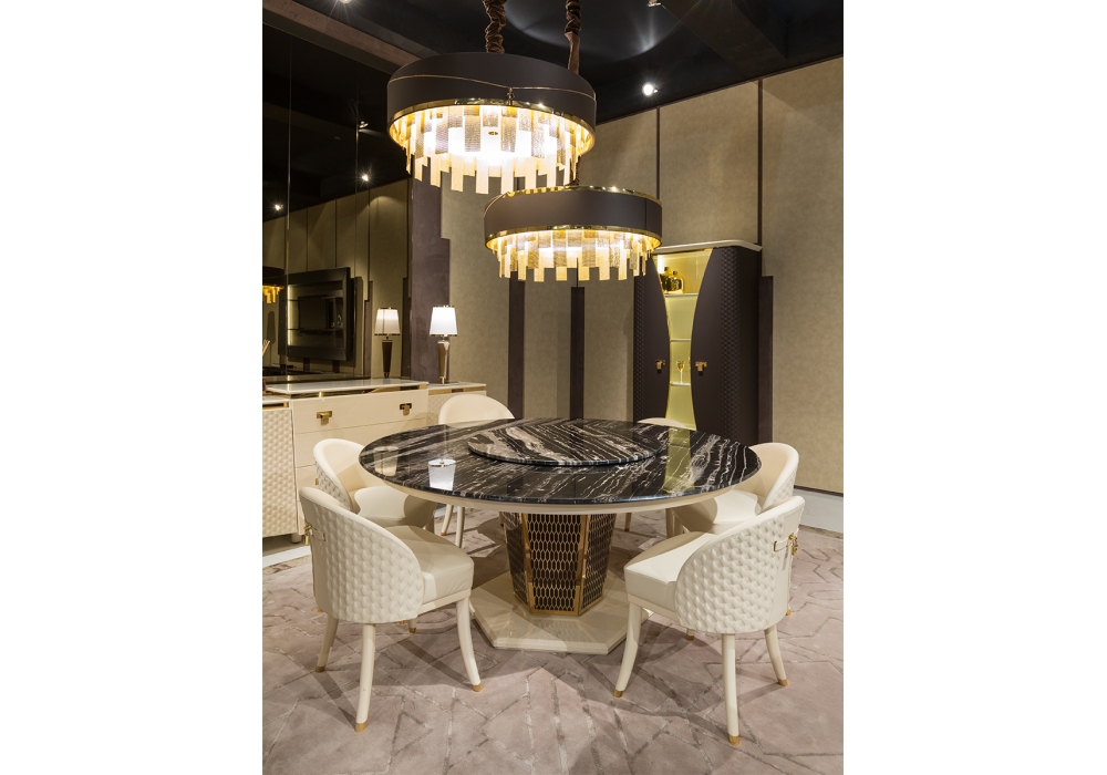 Vogue firmato da Andrea Bonini per Turri è un tavolo rotondo da una gamba centrale rivestita in pelle con l’applicazione di una griglia in metallo oro. Il piano è realizzato in legno finitura laccato lucido o marmo. Disponibile in diverse dimensioni.