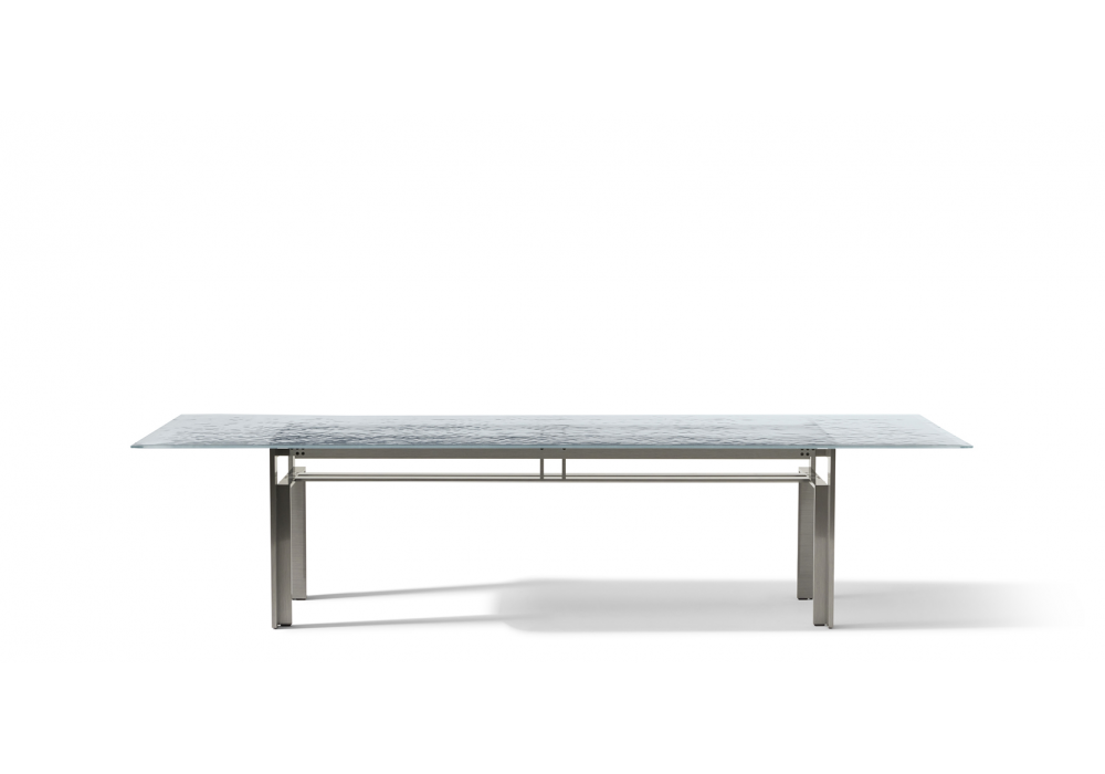 Doge Laguna firmato da Carlo Scarpa per Cassina è un tavolo realizzato con struttura in acciaio e piano in vetro extra-chiaro ondulato sabbiato.