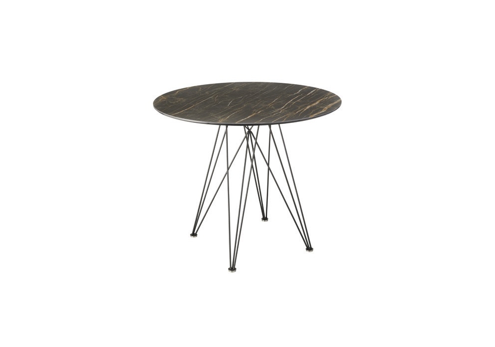 Pegaso Snack firmato da Riflessi è un tavolo Bar con piano in ceramica bisellata stratificata su vetro. Base in metallo verniciato grafite. Disponibile in diverse dimensioni.