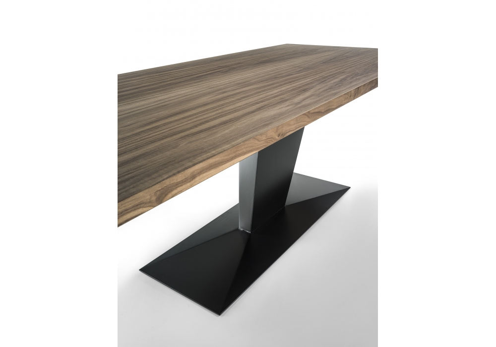 Simple Blues firmato da Studio Excalibur per Riva 1920 è un tavolo con top in legno listellare impiallacciato e bordi smussati, in abbinata ad una base in ferro costituita da gamba decentrata ed inclinata, posizionata lateralmente, e piastra a pavimento.