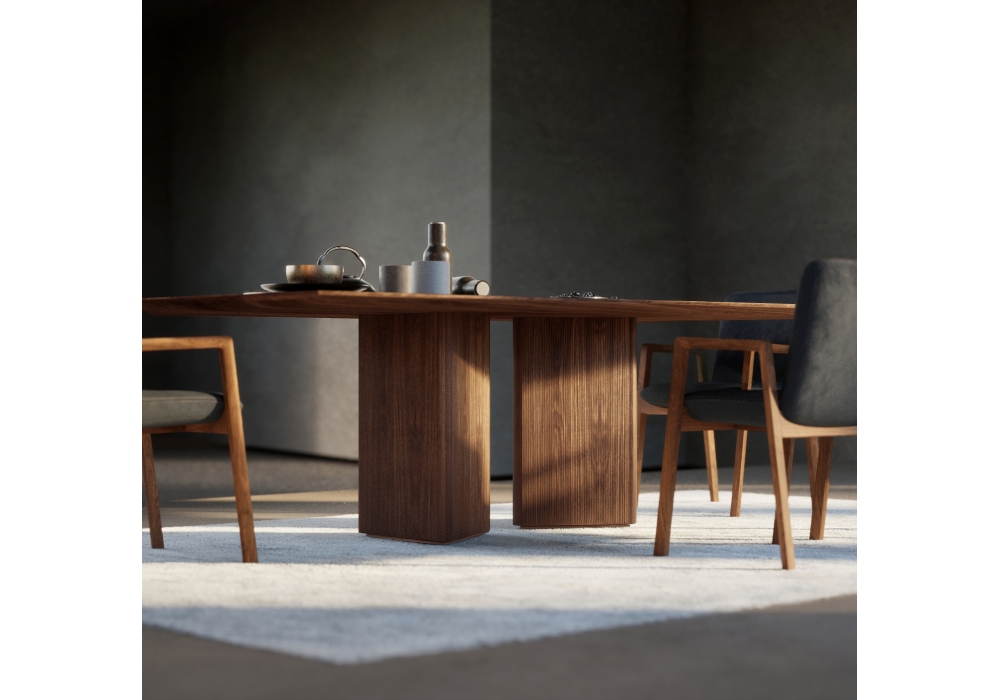 Revo firmato da Giuliano & Gabriele Cappelletti per Riva 1920 è un tavolo con top realizzato interamente in legno massello a liste incollate con spessore assottigliato. La base è costituita da gambe a forma di prisma, ciascuna caratterizzata da tre vertici in legno massello, e da superfici lisce o con lavorazione Fresart, che crea un effetto geometrico moderno e dinamico.
