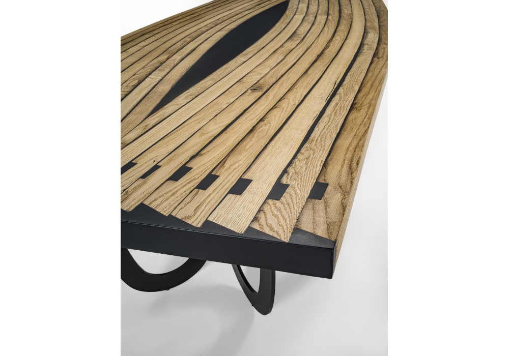 Hypnotic firmato da Studio Excalibur per Riva 1920 è un tavolo con top costituito dall’accostamento di più doghe ricurve intervallate da inserti di resina nera. Le gambe, composte ciascuna da due anelli ovali in ferro, riprendono la forma curva delle doghe del top.