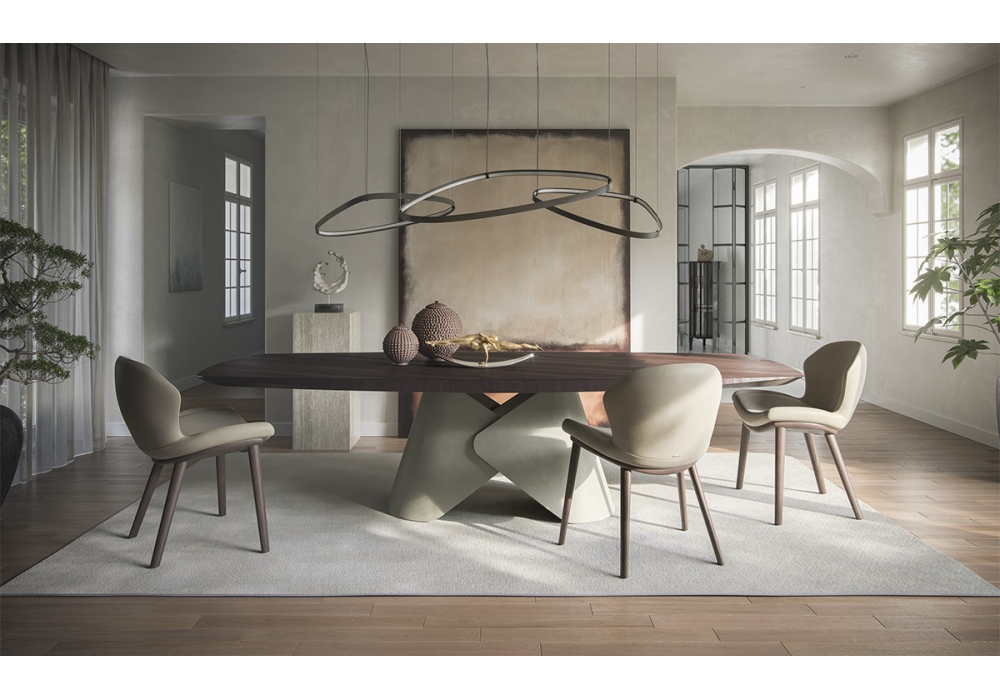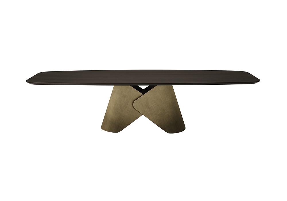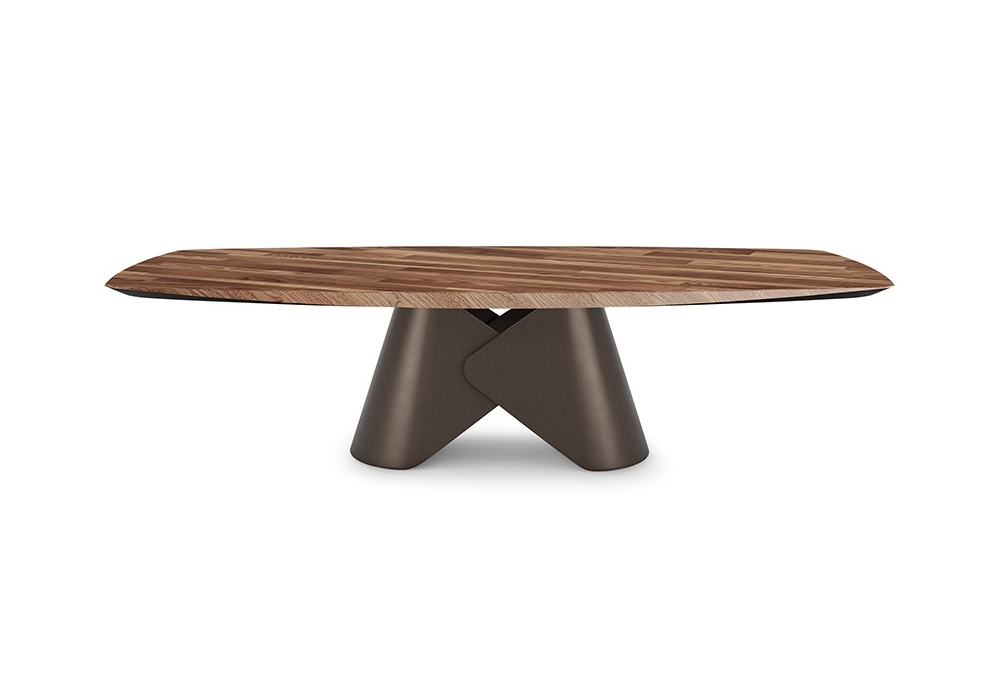Scott Wood firmato da Studio 28 & P. Cattelan per Cattelan Italia è un tavolo con base in acciaio verniciato o Oxybrass, piano a botte con bordi bisellati in noce Canaletto o rovere bruciato (Versione "B"), piano sagomato in noce Canaletto o rovere bruciato realizzato con listelli, diversi tra loro, posizionati in diagonale (Versione "Masterwood"). Bordi obliqui e arrotondati. Disponibile in diverse finiture e dimensioni.