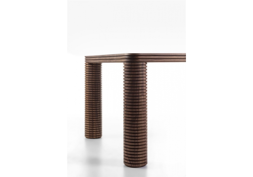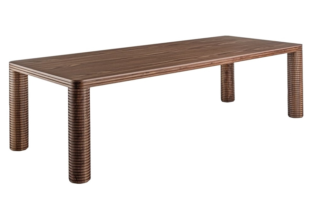Sansiro L firmato da Meneghello Paolelli per Porada è un tavolo da pranzo rettangolare con angoli smussati, struttura in massello di noce canaletta, piano in legno e gambe tornite formate da quattro masselli. Le gambe presentano segni di giunzione in prossimità dell’unione tra i masselli.