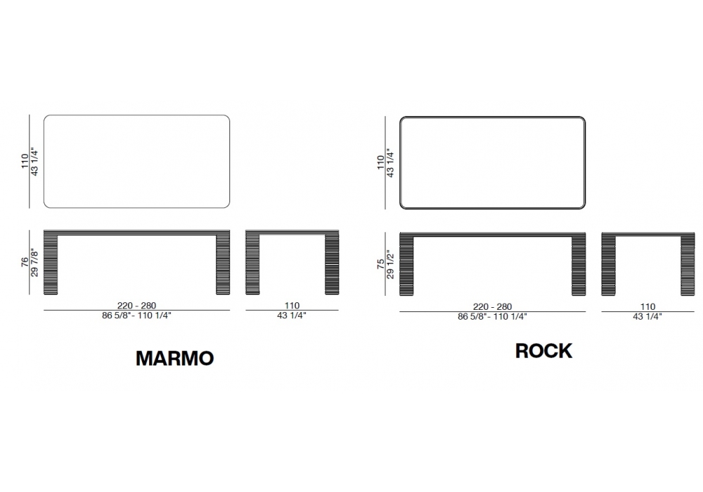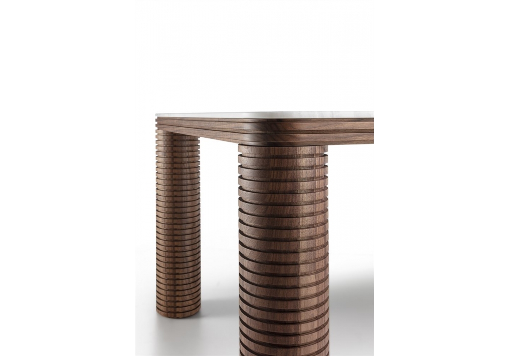 Sansiro firmato da Meneghello Paolelli per Porada è un tavolo da pranzo rettangolare con angoli smussati, struttura in massello di noce canaletta, piano in marmo o rock e gambe tornite formate da quattro masselli. Le gambe presentano segni di giunzione in prossimità dell’unione tra i masselli.