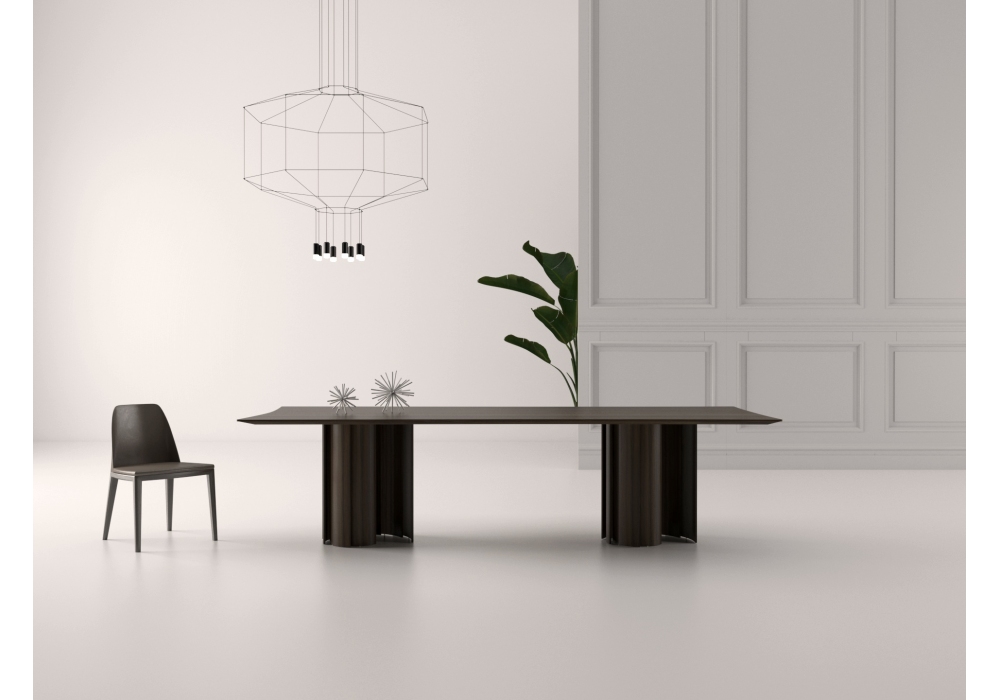 Aurea firmato da Serra By Milia per Escooh è un tavolo con base costituita da sei elementi curvi in legno massello di noce canaletto e piano in cristallo, legno o marmo. Appoggi in metallo bronzato spazzolato. Disponibile in diverse dimensioni.