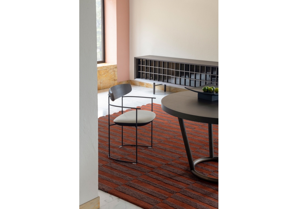 Pipe firmato da Favaretto & Partners per Potocco è un tavolo estensibile tondo interamente in massello di frassino in diverse finiture. Basamento tubolare in ottone brunito.