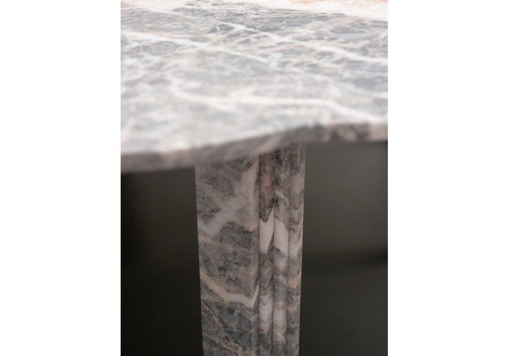 Orpheus firmato da Lorenzo Bini per Tacchini è un tavolo in marmo fior di pesco, sostenuto da 5 gambe ottenute accostando listelli dello stesso marmo leggermente sfalsati.