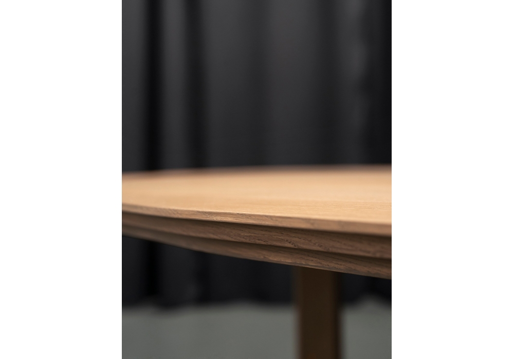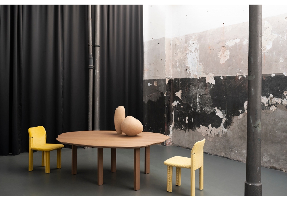 Parker firmato da Lorenzo Bini per Tacchini è un tavolo in rovere grigio o naturale, sostenuto da 5 gambe ottenute accostando listelli dello stesso legno leggermente sfalsati.