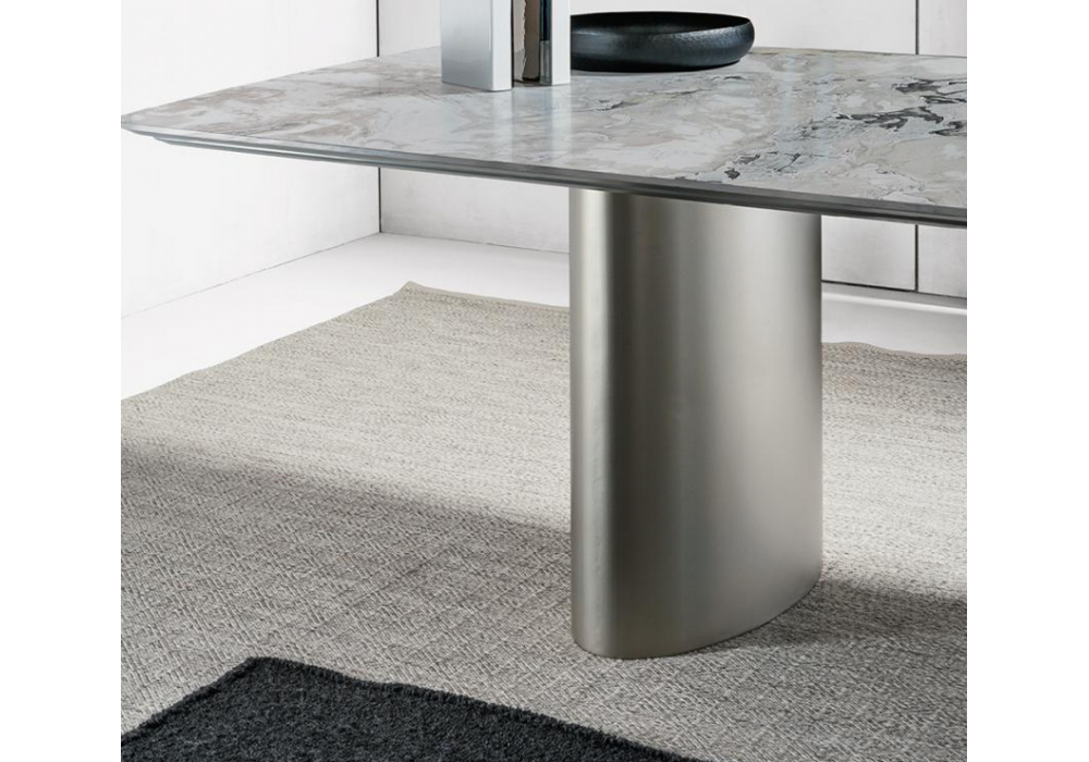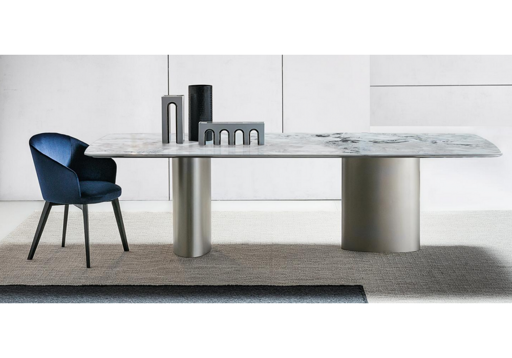 Tangeri firmato da Roberto Lazzeroni per Casamilano è un tavolo con piano in marmo e gambe ovali in metallo verniciato. Sottopiano in MDF laccato.