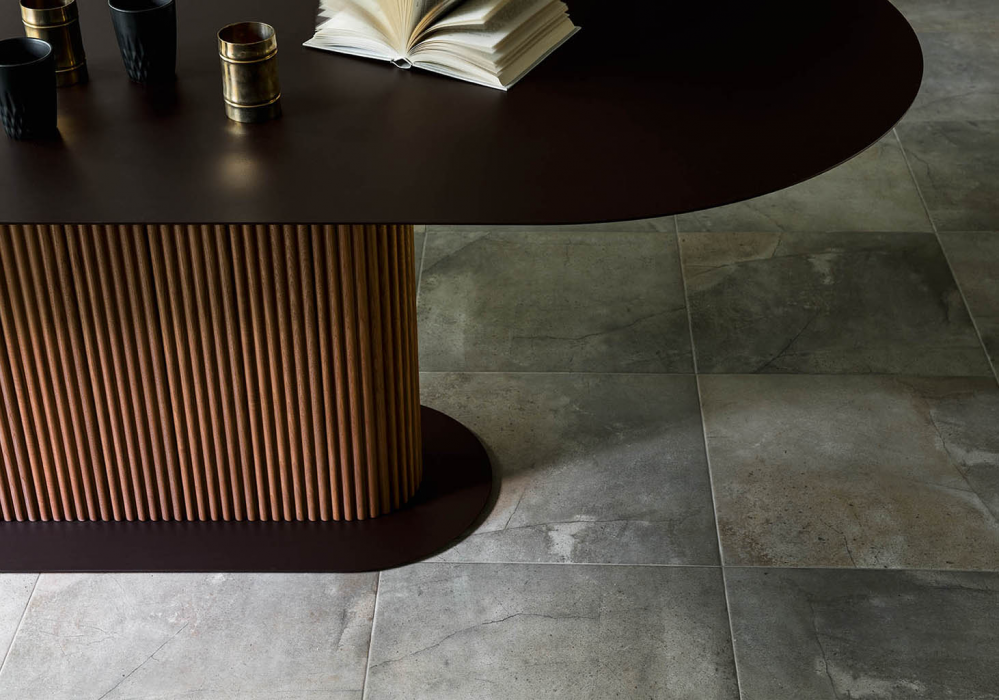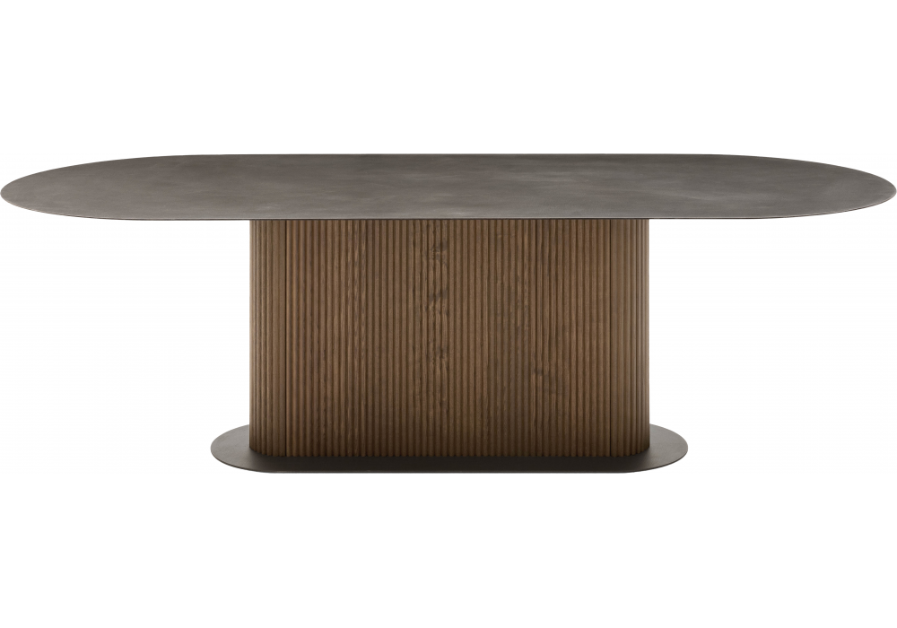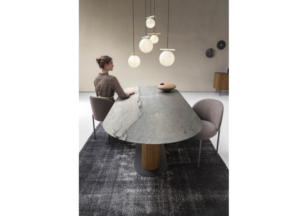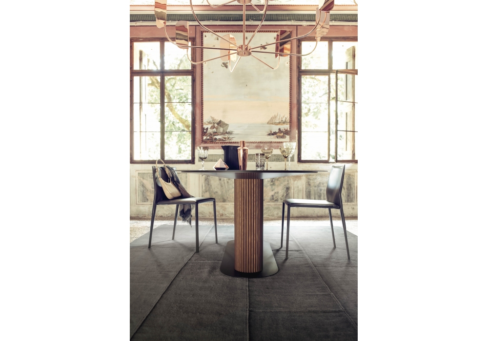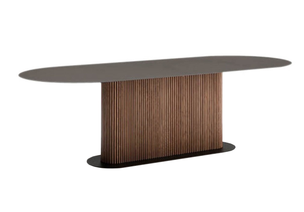 Rigadin firmato da Gordon Guillaumier per Alf Dafrè è un tavolo con struttura in frassino tinto noce e piano in marmo, pietra lavica o metallo verniciato.