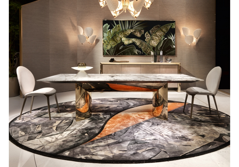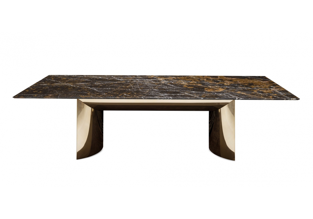 Kerwan Marble firmato da Alessandro La Spada per Visionnaire è un tavolo di forma quadrangolare con basamento in acciaio inox curvato sui lati e sulla parte bassa centrale. Il top è in lastra di marmo con bordo bisellato in negativo e sottotop in legno laccato. Kerwan Marble è disponibile in differenti modelli e finiture.
