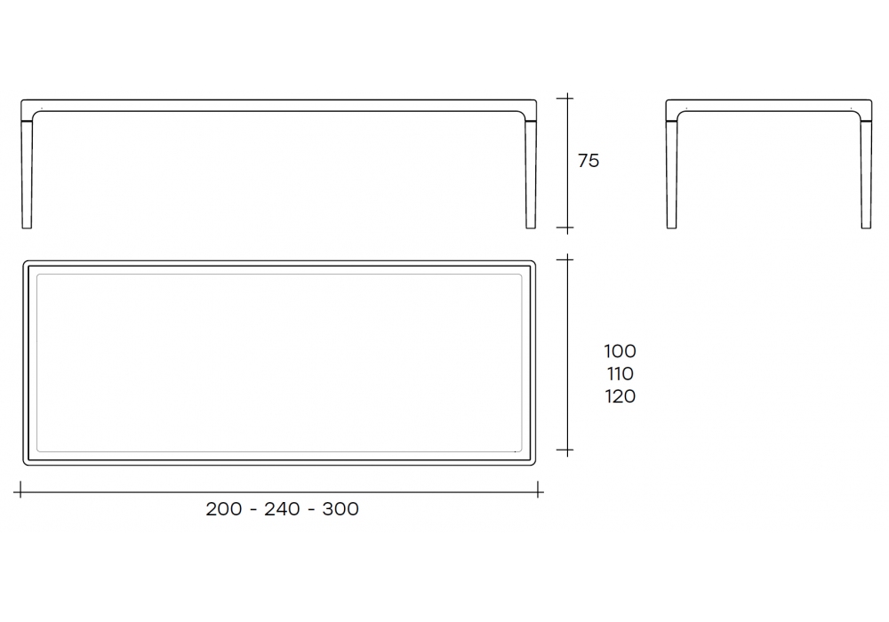 | Dimensioni | 200 x 100 x H 75 cm; 240 x 100 x H 75 cm; 300 x 100 x H 75 cm. |