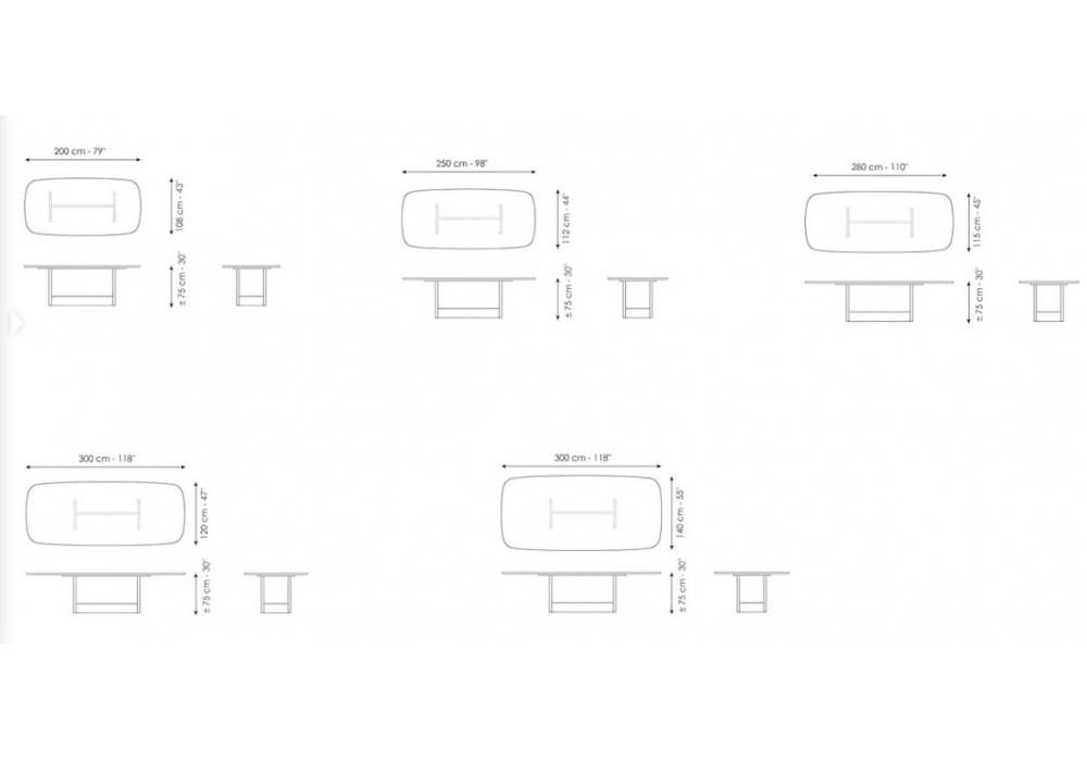 | Dimensioni | • 200 x 108 x H 75 cm; • 250 x 112 x H 75 cm; • 280 x 115 x H 75 cm; • 300 x 120 x H 75 cm; • 300 x 140 x H 75 cm |