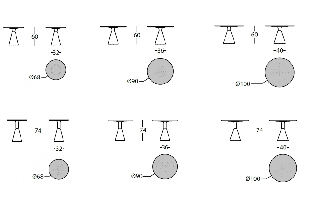 | Dimensioni | • Ø 68 x H 60 cm; • Ø 90 x H 60 cm; • Ø 100 x H 60 cm; • Ø 68 x H 74 cm; • Ø 90 x H 74 cm; • Ø 100 x H 74 cm |