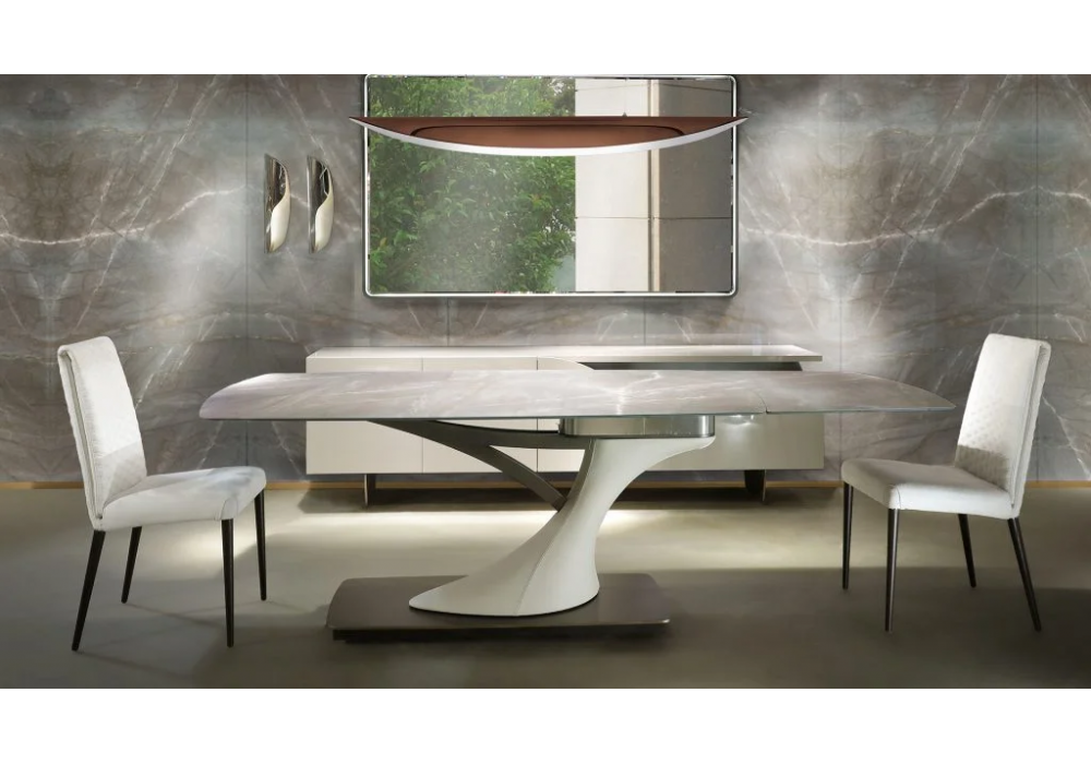 Archimede 72 firmato da Riccardo Lucatello per Reflex Angelo è un tavolo allungabile realizzato con struttura e piastra in metallo, gambe rivestite in pelle e piano in in Marmoreflex/Legnoreflex. Disponibile in diverse finiture e dimensioni.