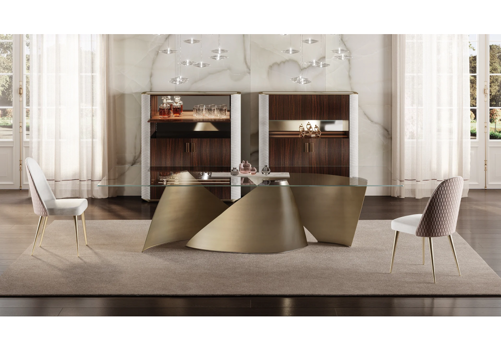 Vele 72 firmato da Reflex Angelo è un tavolo da pranzo con basi in metallo curvato nella finitura satinata: ottone, ottone scuro, titanio. Piano in vetro con bordo lucido.