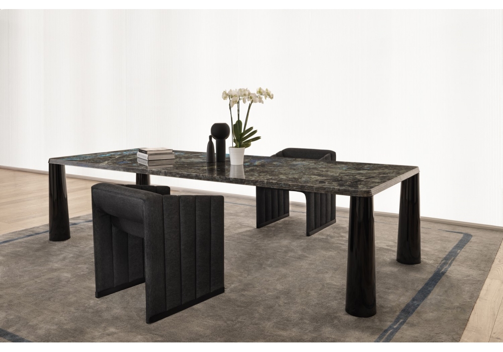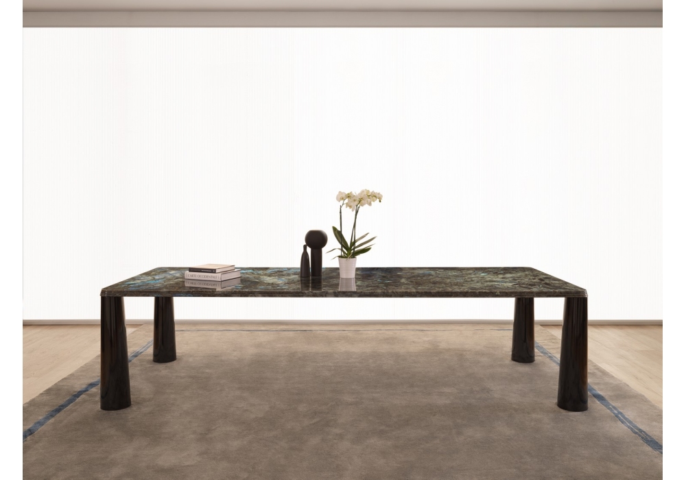 Wellen firmato da Toan Nguyen per Karl Lagerfeld Maison è un tavolo con piano in marmo Lemurian Blue Labradorite e gambe realizzate in Black Liquid. Disponibile in due dimensioni.