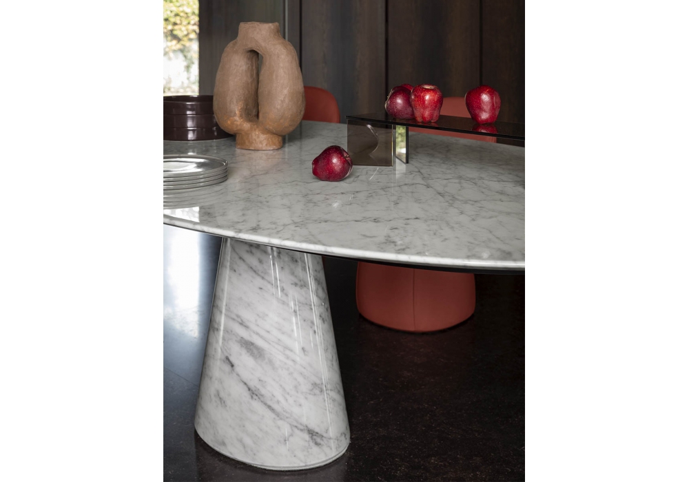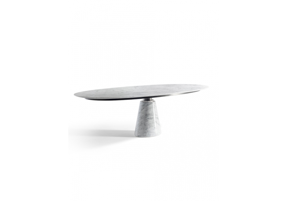 Mesa Ellipse firmato da Lella & Massimo Vignelli per Poltrona Frau è un tavolo, disponibile in diverse dimensioni e finiture, con top in marmo lucido o semi-lucido, trattato per resistere ai liquidi e garantire una maggiore durata nel tempo. La parte inferiore del piano è rinforzata con una rete tecnica per aumentarne la resistenza. La struttura di supporto è in acciaio verniciato, composta da un elemento tubolare e un telaio metallico chiuso da una lamiera di alluminio verniciato nero opaco. Il basamento centrale a colonna è proposto in vari materiali, marmo (in abbinamento alla fi nitura del piano), cuoio Saddle Extra o Pelle Frau® ColorSphere® (con cuciture tono su tono).