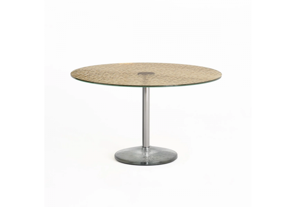 Contro Peso firmato da Ronan Bouroullec per Glas Italia è un tavolo con piano in cristallo stratificato ed una superficie ondulata dall'aspetto liquido, si sostiene su una base composta da un tubo in acciaio inox lucidato a specchio e da un piede conico in cristallo colato, specchiato tramite argentatura manuale. Il piano è smontabile e fissato alla base tramite una piastra d’acciaio inox lucidata a specchio. Disponibile in diverse finiture e dimensioni.