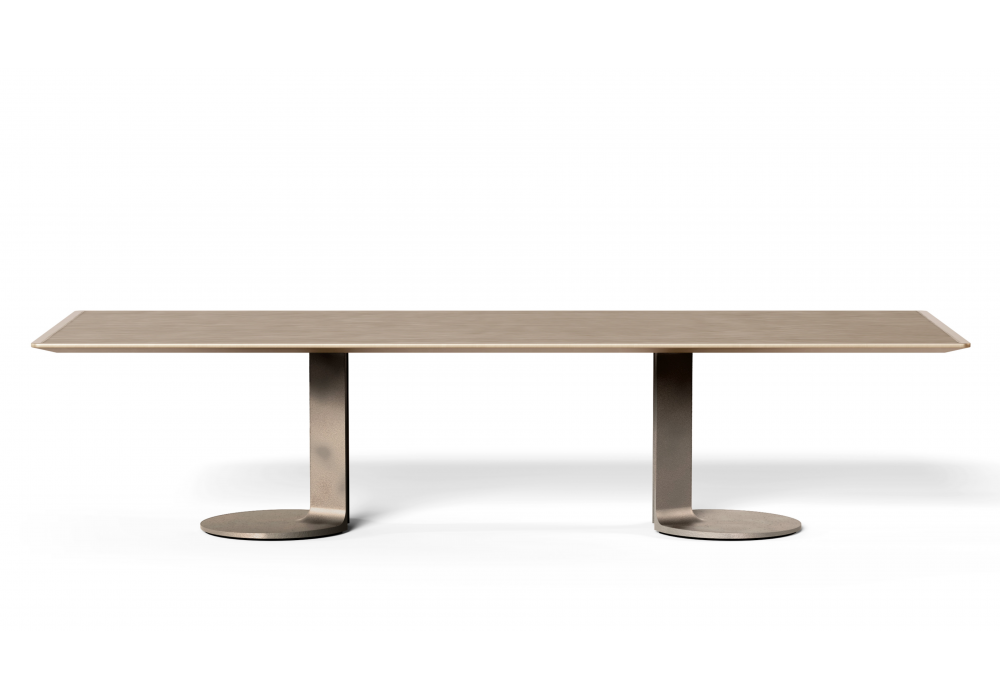 TL59 firmato da Afra & Tobia Scarpa per Cassina è un tavolo rettangolare realizzato con base doppia e piano con applicazione di metallo.