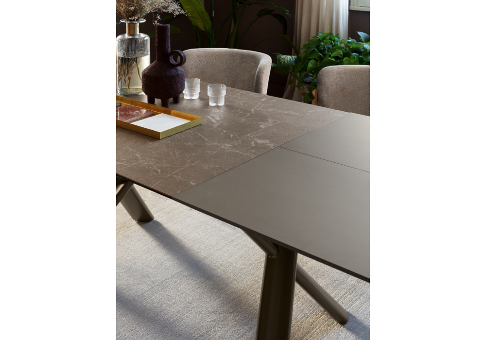 Master firmato da Connubia è un tavolo con struttura in metallo e top in ceramica, allungabile con meccanismo di apertura a cassonetto. Disponibile in diverse finiture e dimensioni.