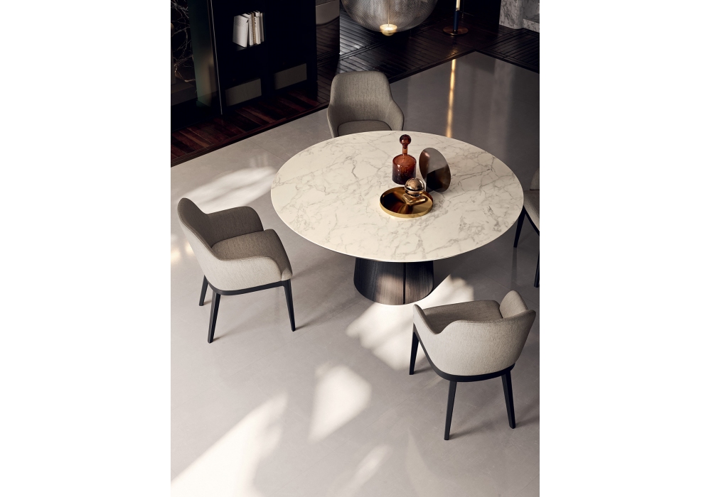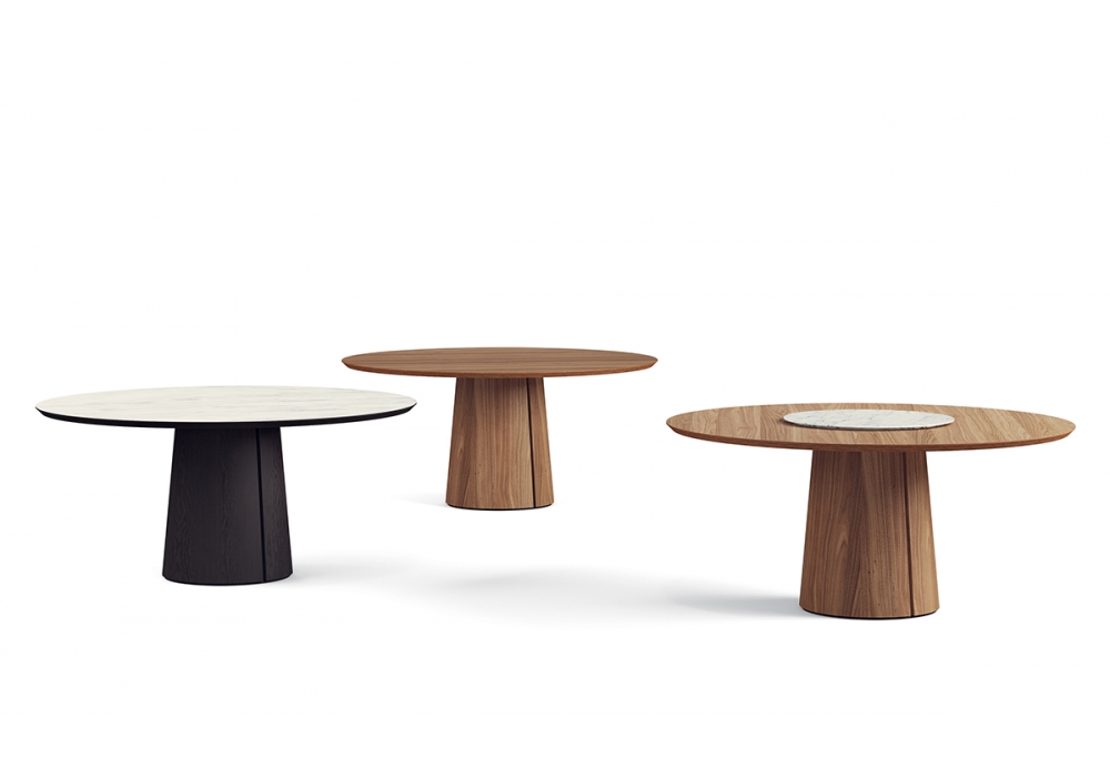Arona firmato da Kico è un tavolo rotondo con base centrale tronco-conica rivestita in Noce Canaletto, disponibile in diverse finiture. Il piano da 160 cm con bordo arrotondato è proposto in Frassino, Noce Canaletto o Gres e può integrare una Lazy Susan centrale.