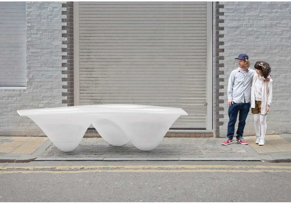 Aqua Table firmato da Zaha Hadid di Established&Sons è un tavolo stampato in vetro rinforzato e fibra di vetro poliestere con un software architetturale e rivestito con vernici poliuretaniche. Disponibile in differrenti fniture.
