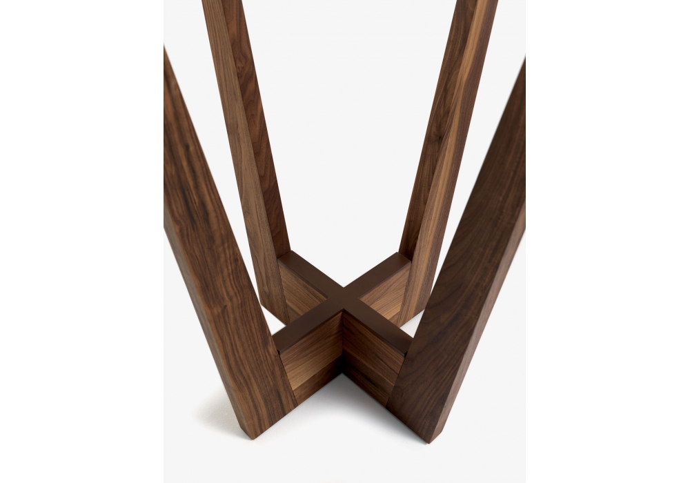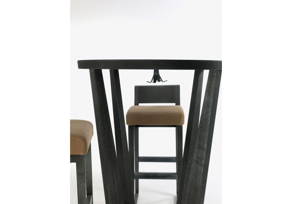 Parla firmato da Karsten Schmidt-Hoensdorf per Riva 1920 è un tavolo snack rotondo, interamente realizzato in legno massello con top a liste incollate, caratterizzato da un basamento a raggiera con inserti in metallo funzionale come poggiapiedi. Accessorio portaborse opzionale.