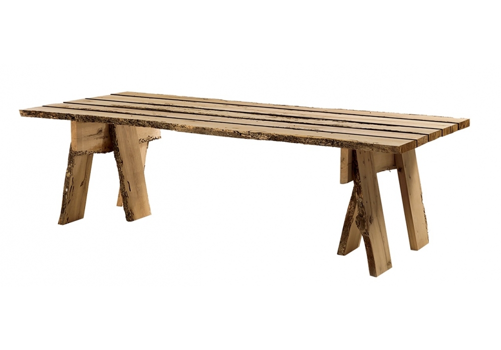 Frammenti di Wabi-Sabi firmato da Aldo Cibic per Riva 1920 è un tavolo con top realizzato in legno massello di Briccola, a liste accostate e bordi naturali, dotato di gambe a cavalletto con diverse inclinazioni.