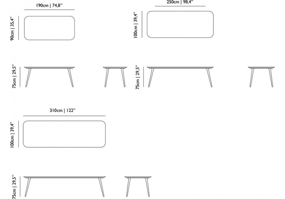 | Dimensioni | 190 x 90 x H 75 cm; 250 x 100 x H 75 cm; 310 x 100 x H 75 cm. |