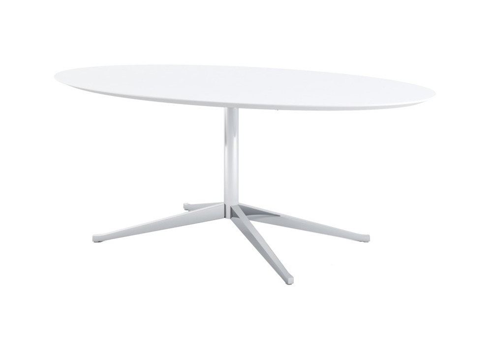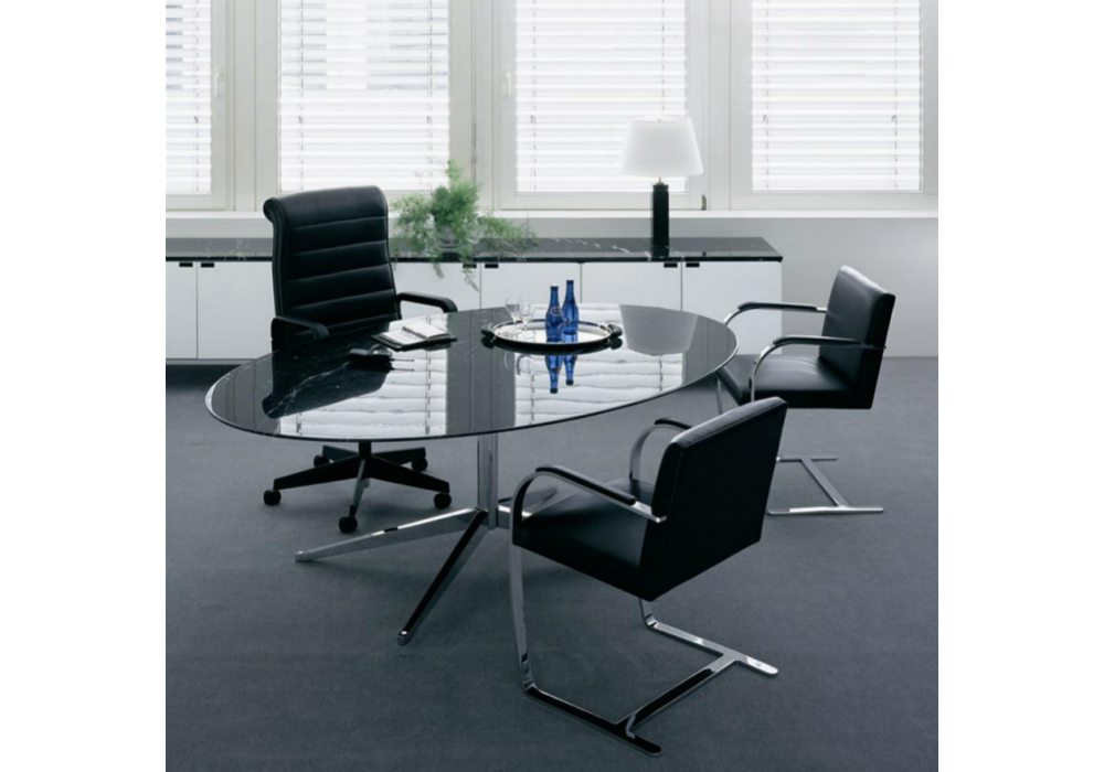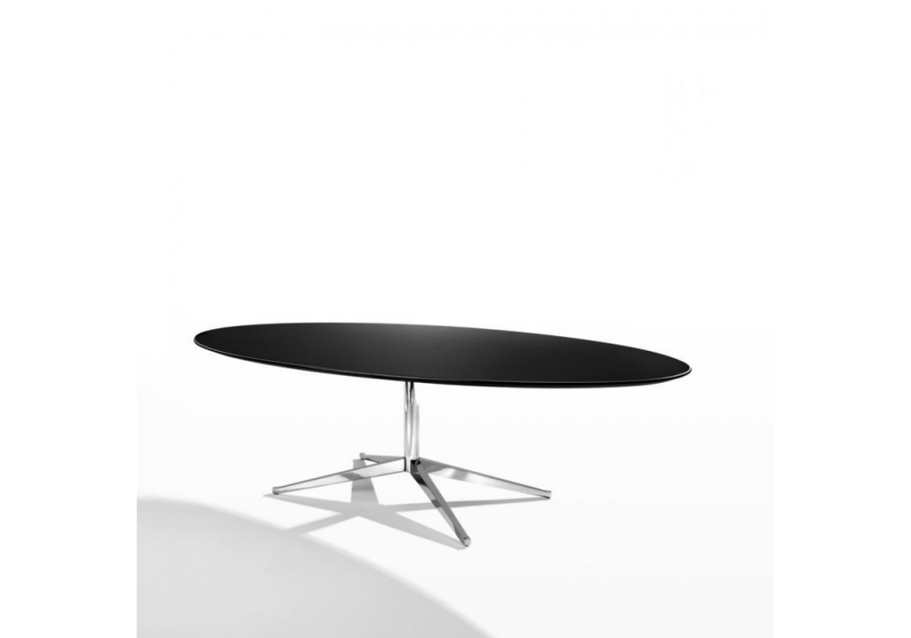 Florence firmato da Florence Knoll per Knoll è un tavolo scrivania ovale con base in acciaio cromato o lucido e piano in marmo, laminato o legno in varie finiture.