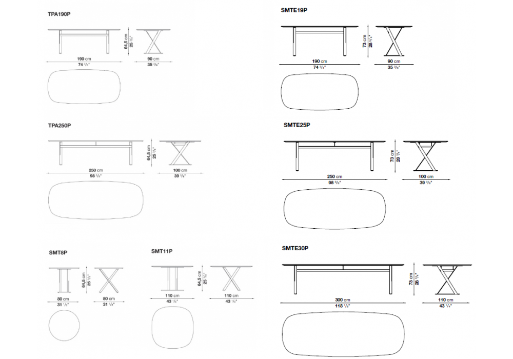 | Dimensioni | 190 x 90 x H 64.5 cm (ellittico); 190 x 90 x H 73 cm (ellittico); 250 x 100 x H 64.5 cm (ellittico); 300 x 110 x H 73 cm (ellittico); Ø 80 x H 64.5 cm; 110 x 110 x H 64.5 cm. |