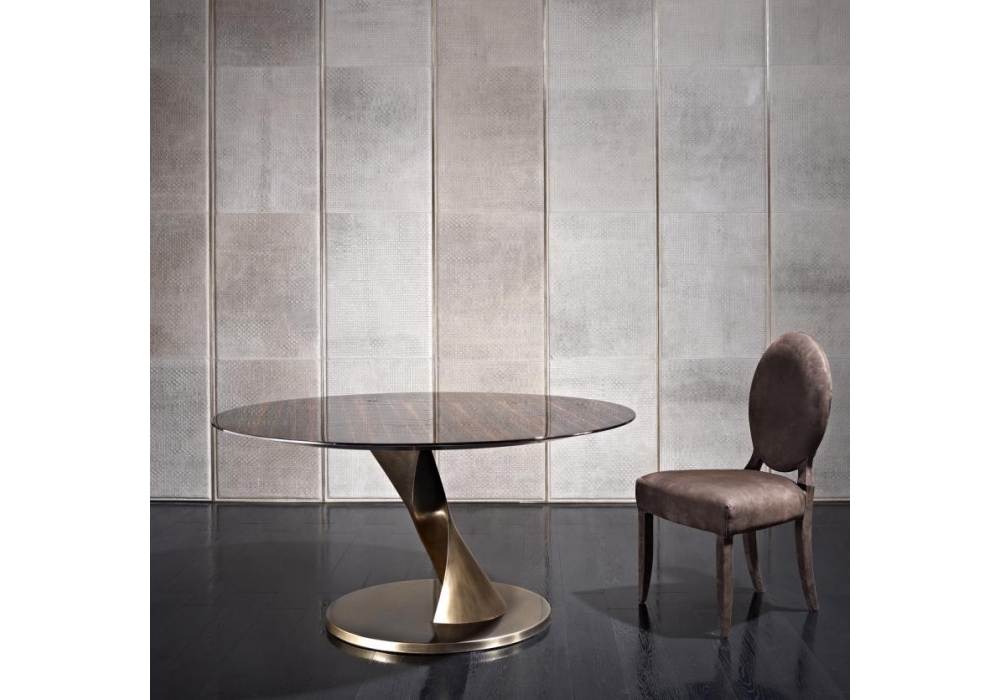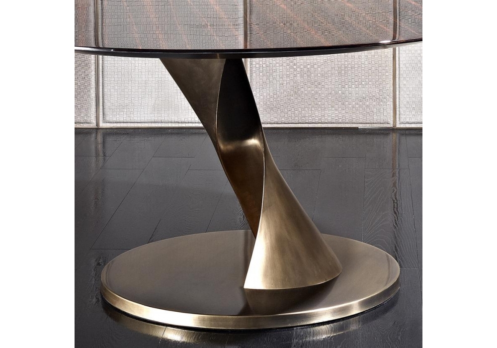 Zoe firmato da Rugiano è un tavolo rotondo disponibili in diverse dimensioni e materiali con differenti finiture, è caratterizzato da dettagli in ottone bronzato.