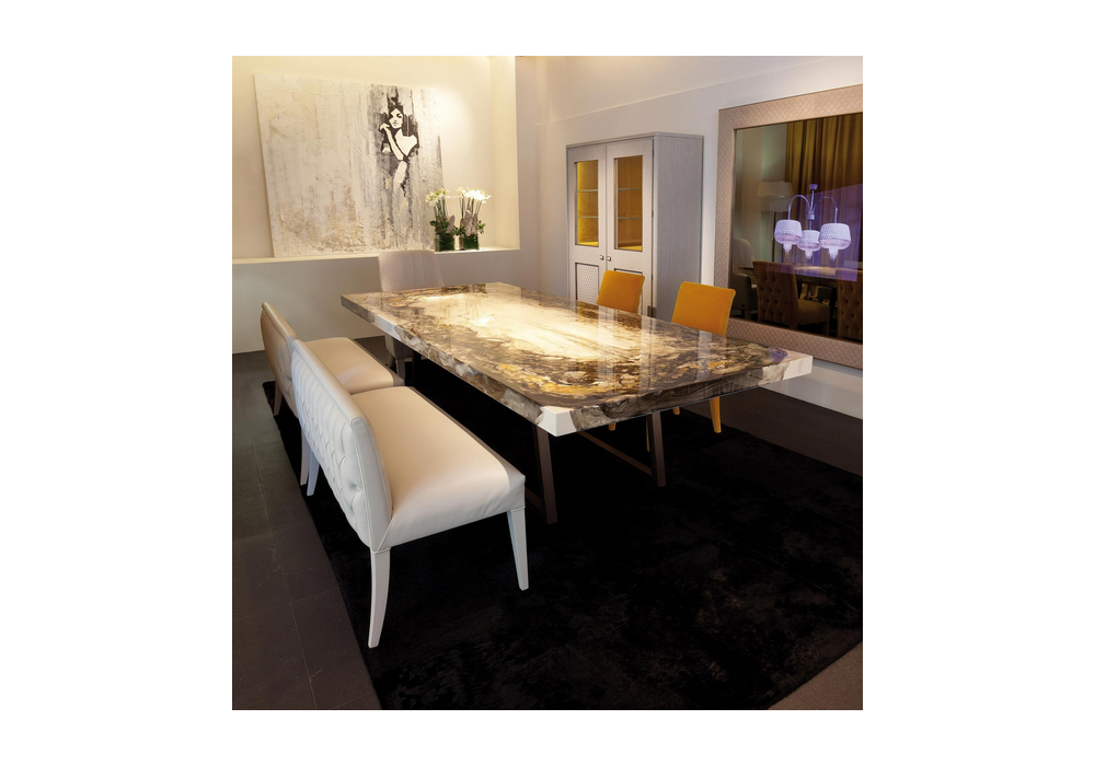 Decoro firmato da Rugiano è un tavolo con piano disponibile in diverse dimensioni e materiali con differenti finiture, è caratterizzato da dettagli in ottone bronzato o cromo.