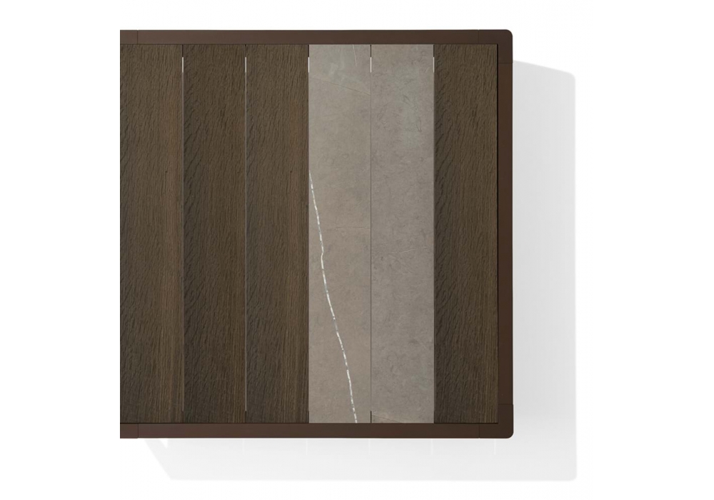 Gea firmato da Chi Wing Lo per Giorgetti è un tavolino da esterni con struttura in acciaio inox protetto verniciato a polvere color carruba. Piano con doghe in rovere abonos, afrormosia e marmo grigio oriente spazzolato configurabili a piacere. Disponibile in diverse dimensioni.