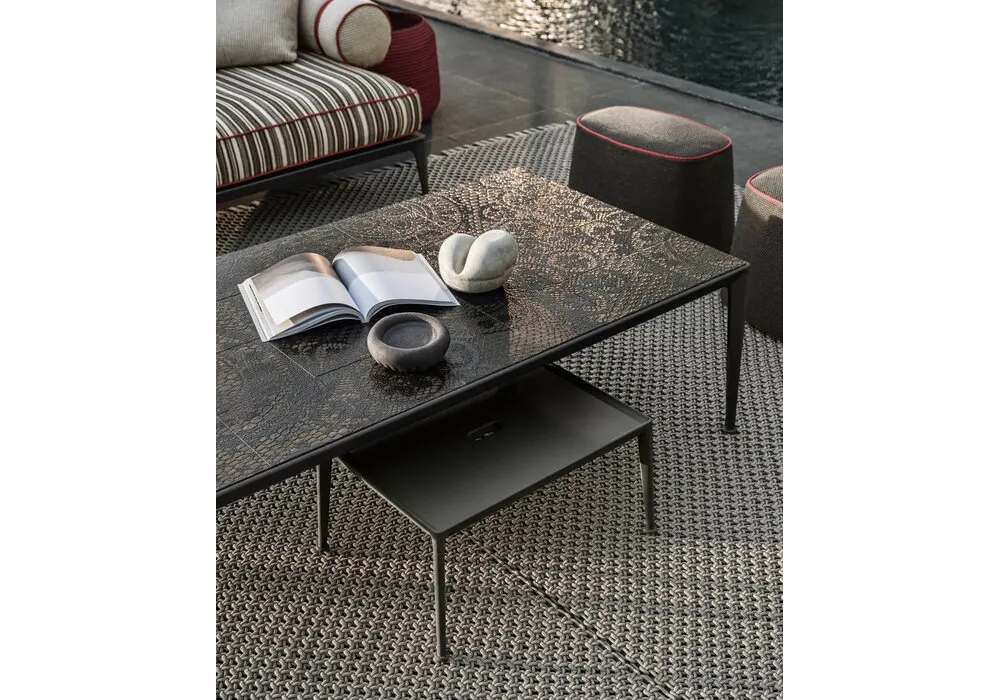 Mirto firmato da Antonio Citterio per B&B Italia Outdoor è un tavolino con struttura in alluminio pressofuso verniciato. Piano in pietra lavica smaltata con decoro nei seguenti colori: antracite, argilla e salvia. Disponibile in diverse dimensioni.
