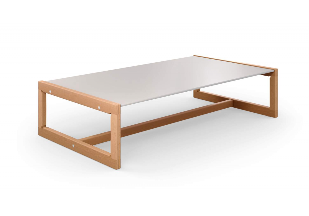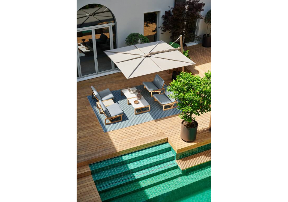 Carlotta firmato da Tobia Scarpa per Cassina è un tavolino da esterno realizzato con struttura in legno massello di teak naturale e piano in gres porcellanato smaltato grigio o avorio. Disponibile in diverse dimensioni.