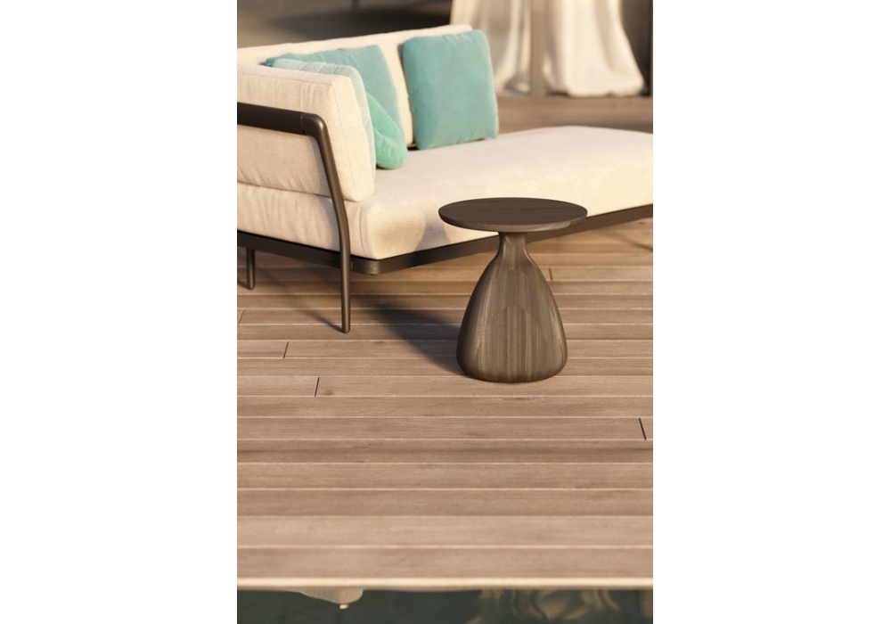 Tsuki firmato da Stephane De Winter per Manutti è un tavolino da esterni con struttura in teak. Disponibile in diverse finiture e dimensioni.