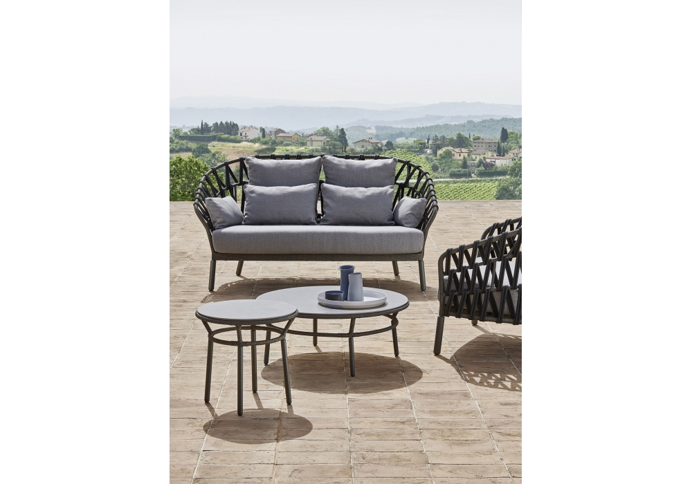 Emma Cross firmato da Monica Armani per Varaschin è un tavolino in alluminio verniciato a polveri intrecciati in corda di fibra sintetica. Piano in Hpl o ceramica. Disponibile in differenti finiture e in due dimensioni.