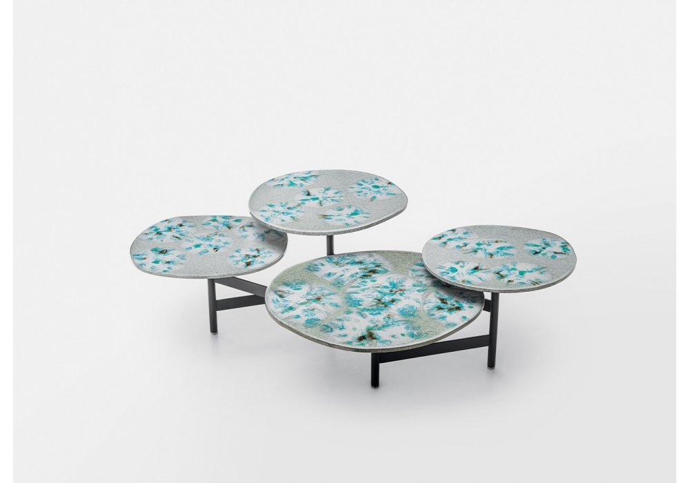 Bouquet firmato da Marella Ferrera per Paola Lenti è un tavolino con quattro piani di appoggio posizionati a differenti livelli. Struttura in acciaio inox verniciato opaco color grigio lava. Piani girevoli, sagomati in pietra lavica naturale decorata in vetro. Adatto per esterni.