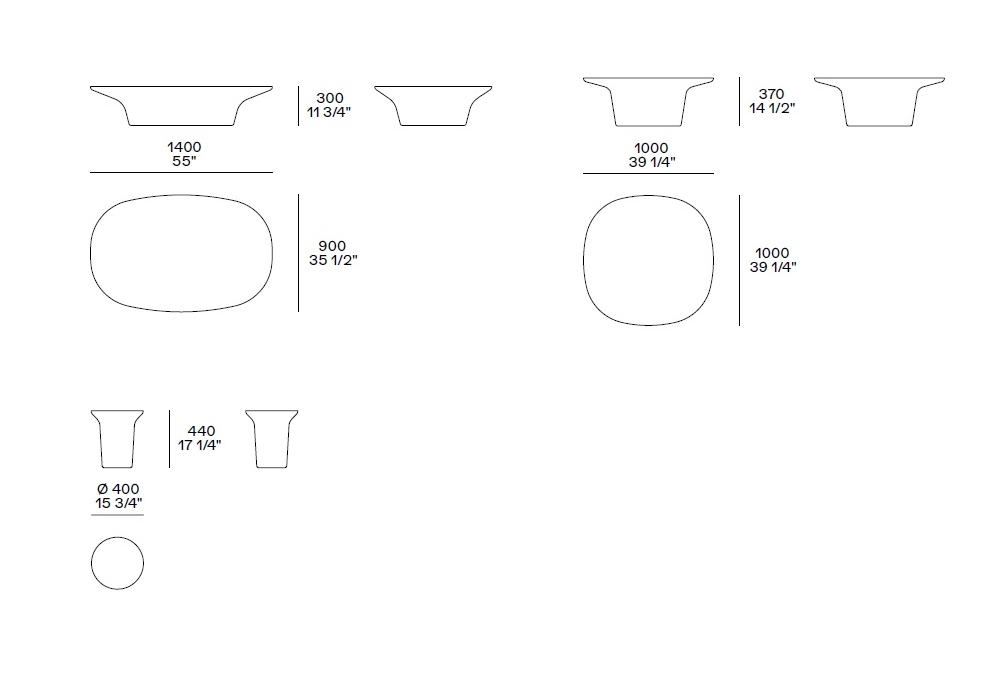 | Dimensioni | 140 x 90 x H 30 cm; 100 x 100 x H 37 cm; Ø 40 x H 44 cm. |