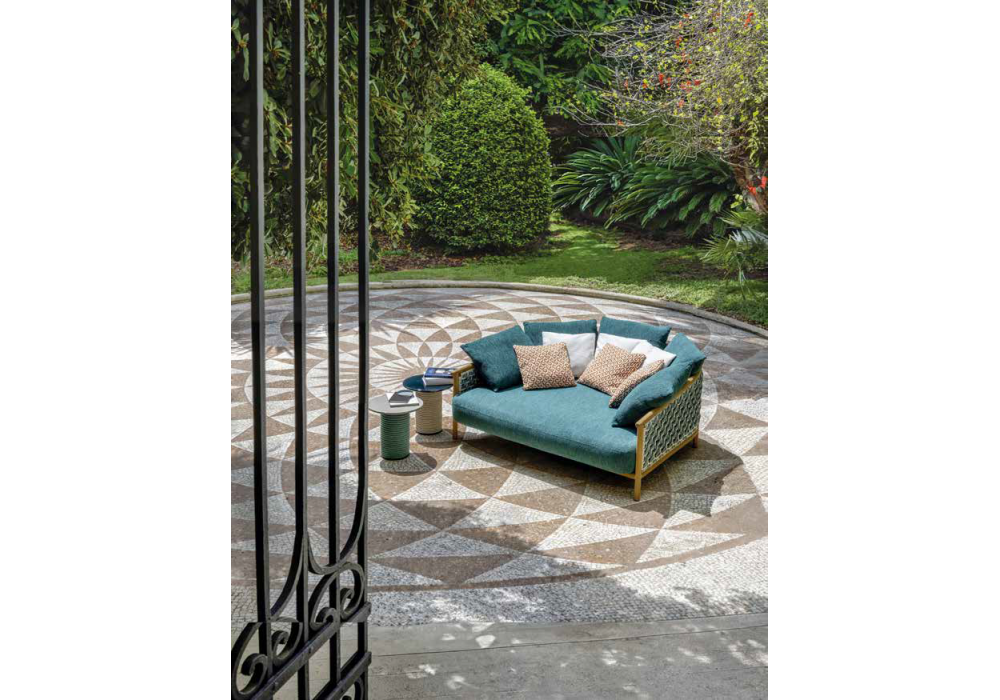 Patio firmato da Zanellato / Bortotto per Ethimo è un tavolino con base in alluminio rivestito da una corda in tessitura piatta. Piano in pietra lavica smaltata.