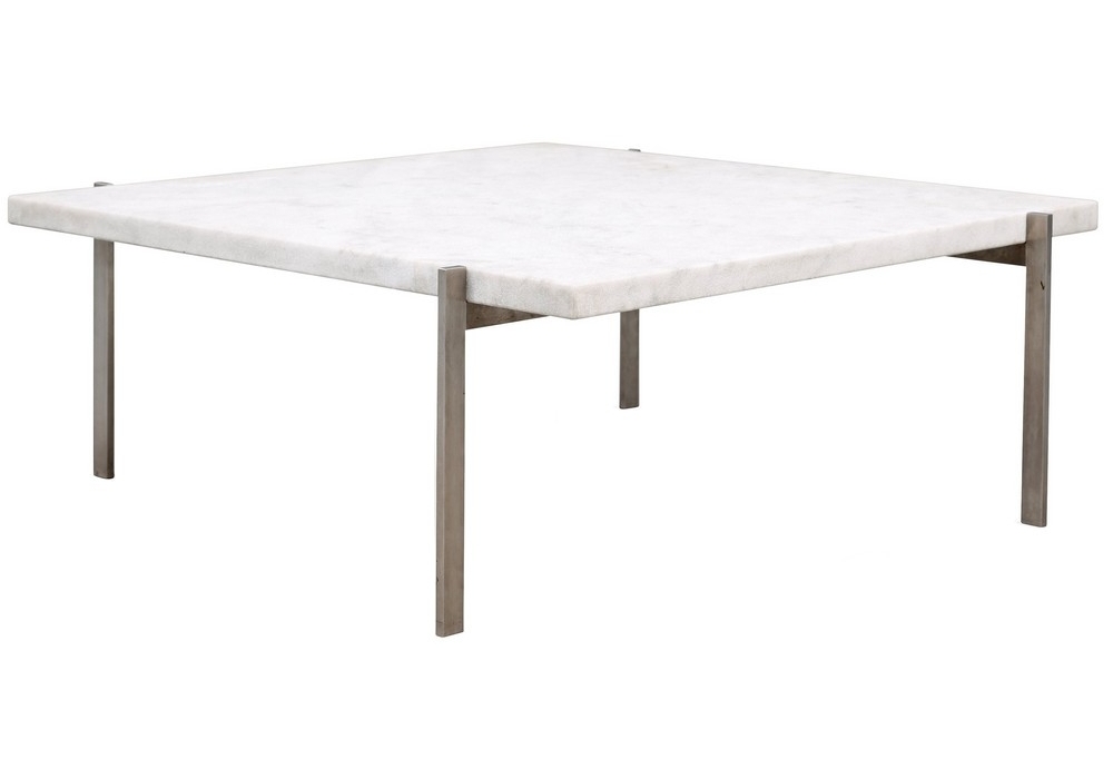 PK61 firmato da Poul Kjærholm per Fritz Hansen è un tavolino realizzato con base in acciaio inox satinato spazzolato e piano in ardesia, marmo, granito, vetro o marmo di Fauske.