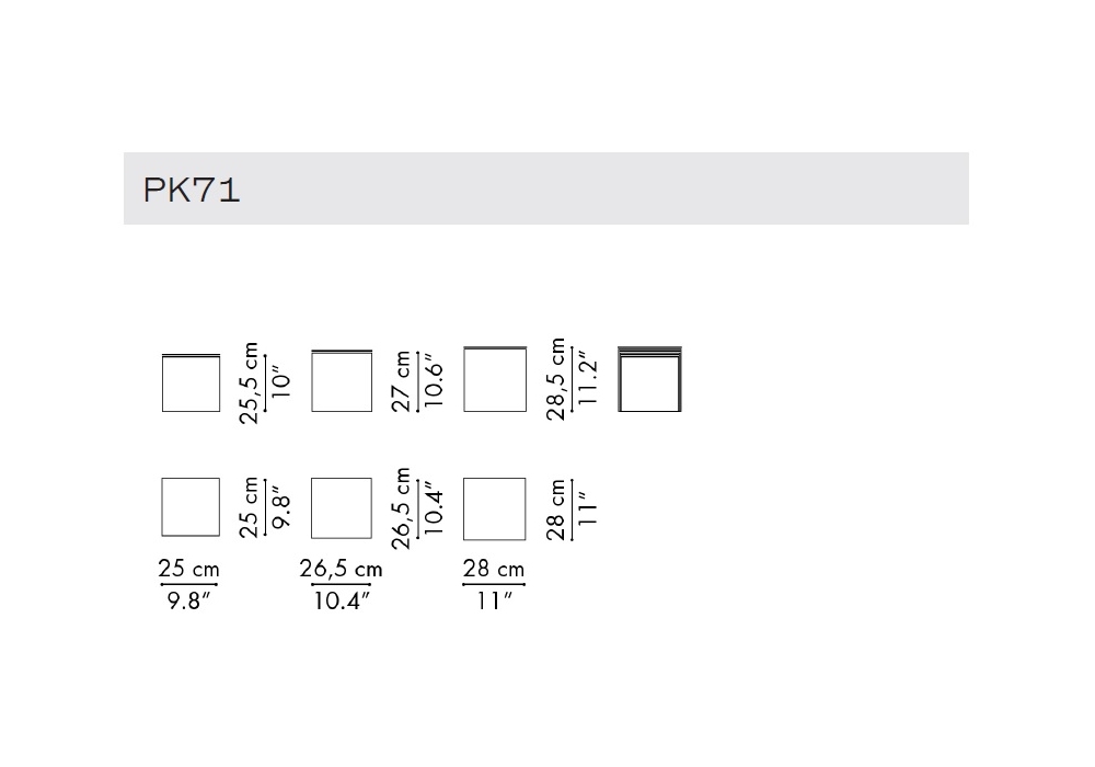 | Dimensioni | 25 x 25 x H 25,5 cm; 26,5 x 26,5 x H 27 cm; 28 x 28 x H 28,5 cm. |