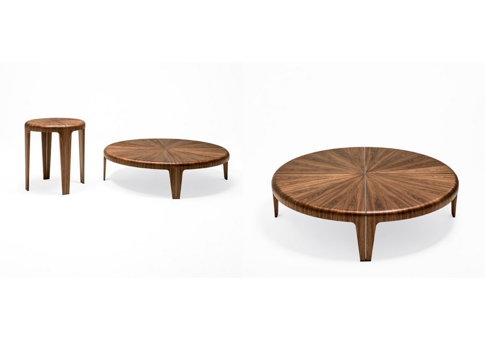 Round è un tavolino disegnato da Carlo Colombo per Giorgetti. Serie di tavolini rotondi con la struttura in pannelli di fibra di legno e impiallacciatura di noce canaletto. Il piano presenta degli inserti in metallo in finitura nichel nero lucido.