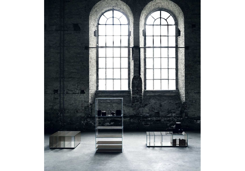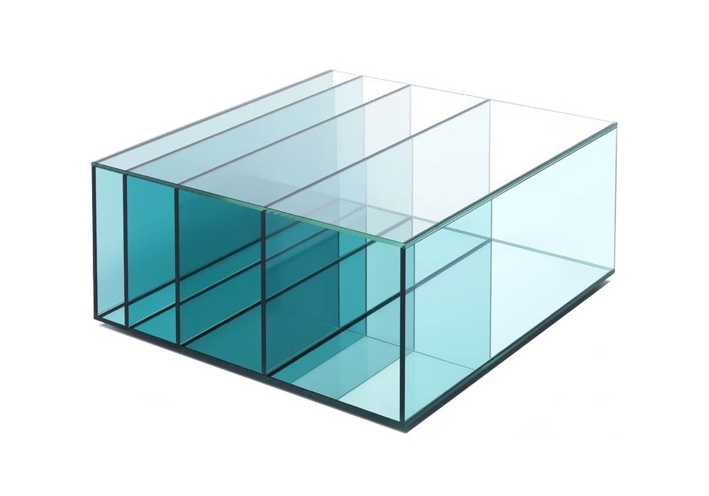 Deep Sea firmato da Nendo per Glas Italia è un tavolino con piano in cristallo trasparente extralight stratificato e termosaldato. Gli elementi verticali sono in cristallo trasparente colorato nei toni del grigio o dell'azzurro.