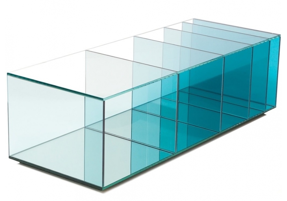 Deep Sea firmato da Nendo per Glas Italia è un tavolino rettangolare con piano in cristallo trasparente extralight stratificato e termosaldato. Gli elementi verticali sono in cristallo trasparente colorato nei toni del grigio o dell'azzurro.